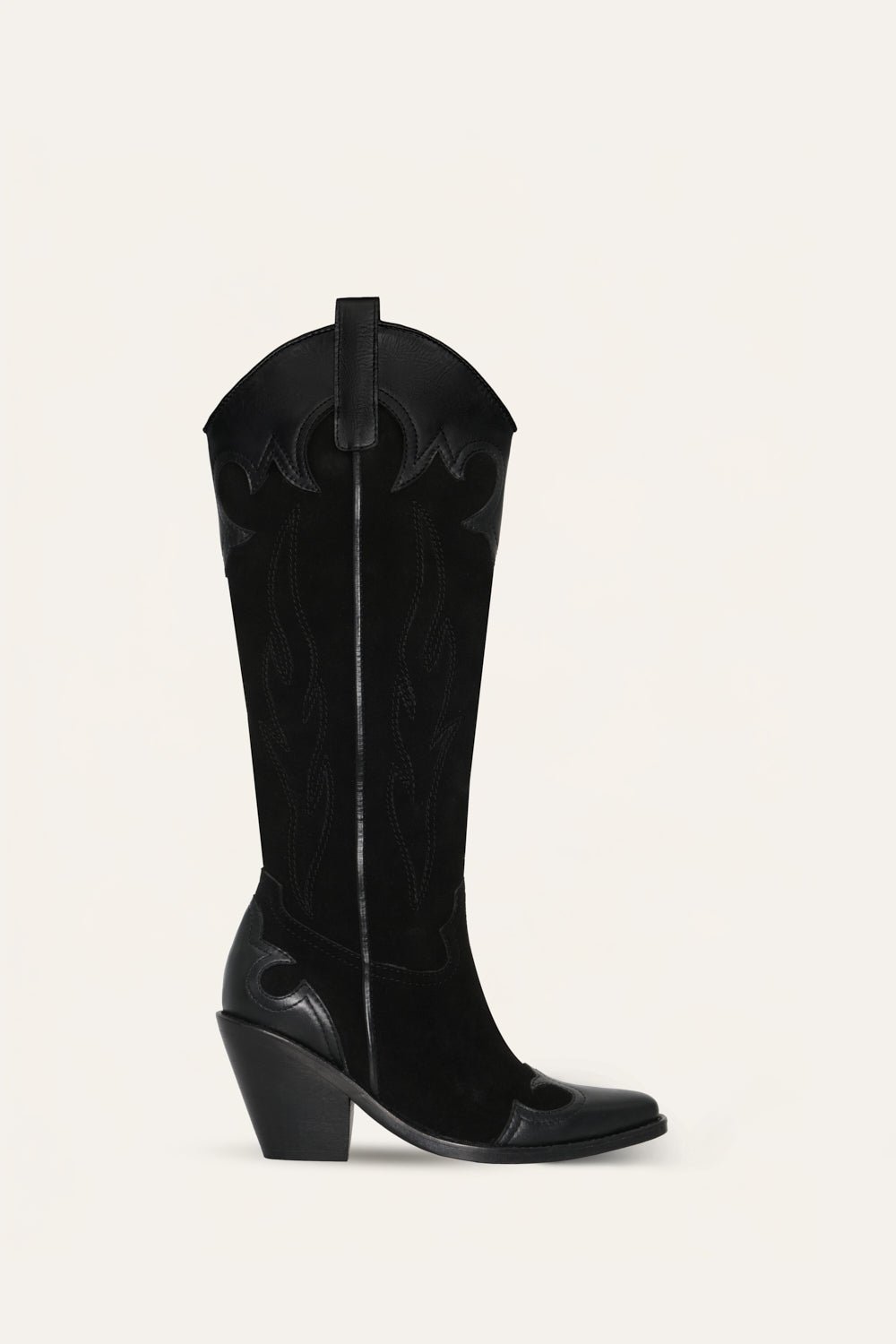 Knee-high boots crafted in soft suede and calf leather, finished with a 5cm heel. Western-inspired appliqués accent the heel, toe, and collar, bringing a cowgirl twist to this sleek, city-ready silhouette.