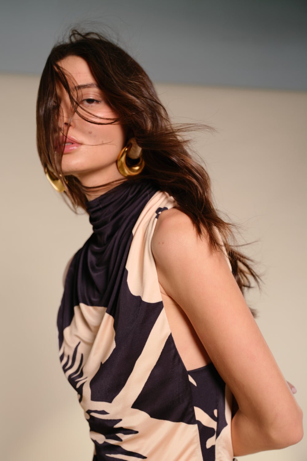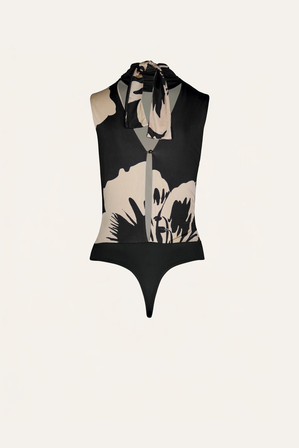 Bodysuit in shiny jersey featuring a draped neckline and bold JO print. Designed for a close fit with a fluid finish. Pair with the matching skirt for a striking look.