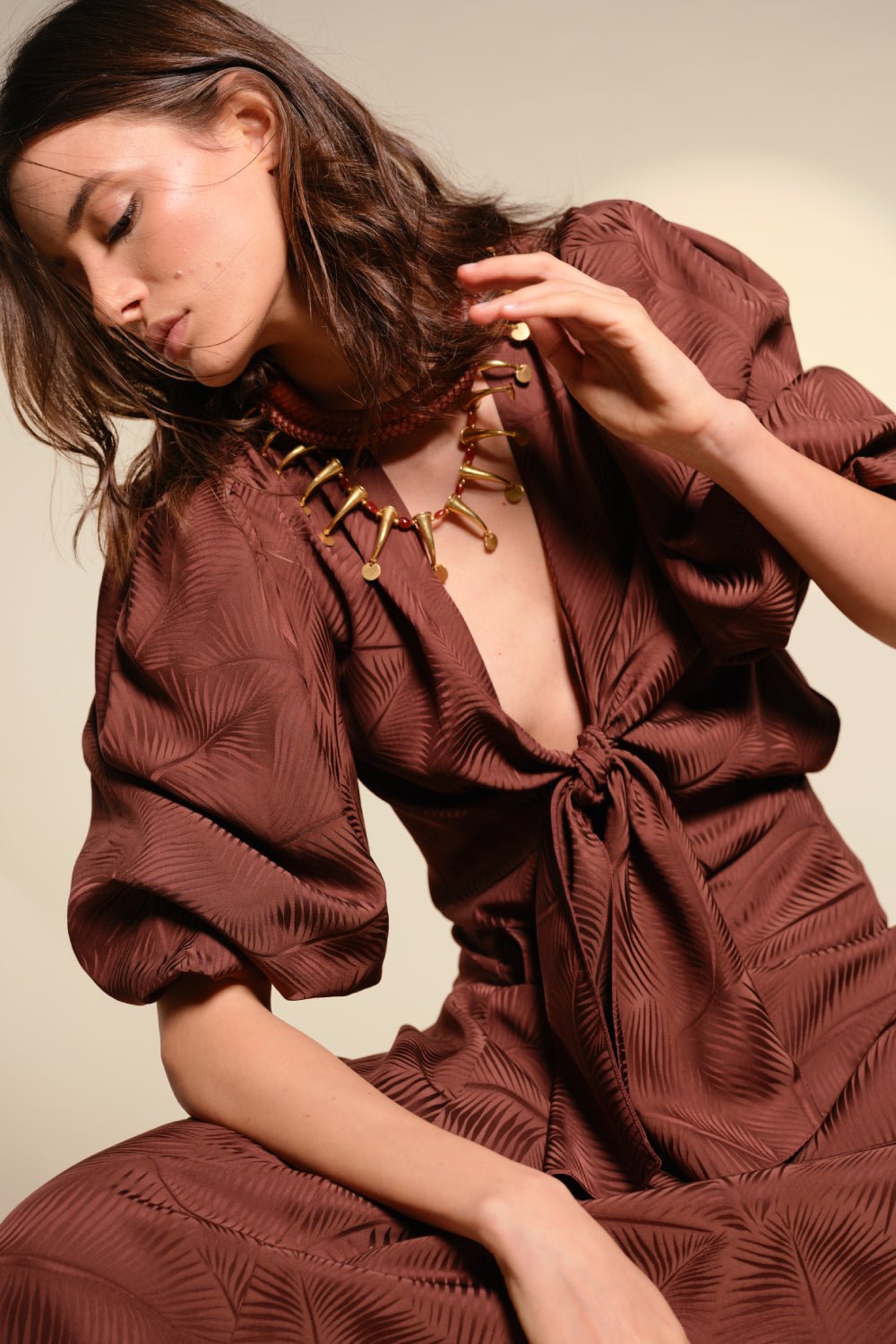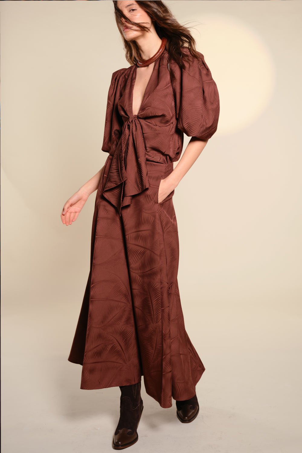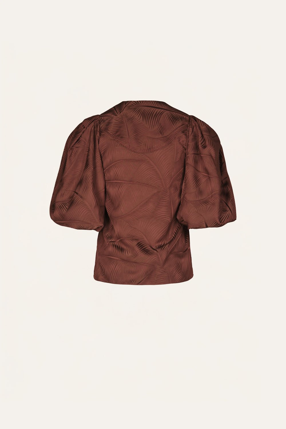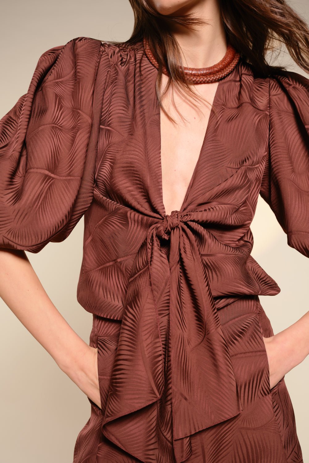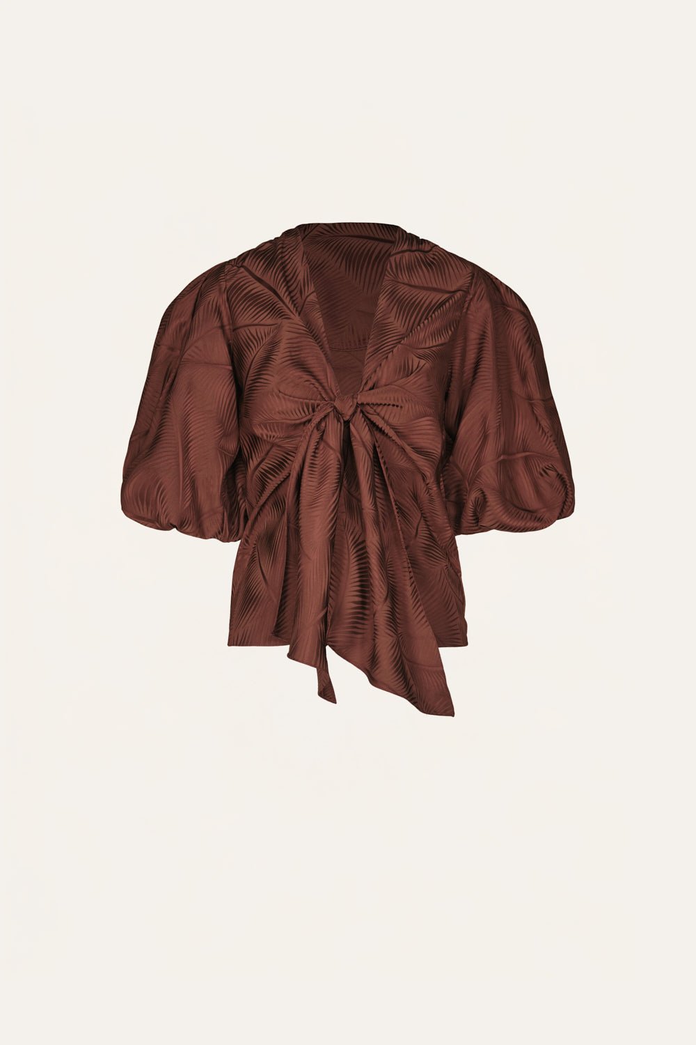 Palmnimal jacquard top with voluminous short sleeves and a deep V-neckline that ties at the waist. Designed to be worn with the matching skirt for a coordinated look, or styled with denim for contrast.