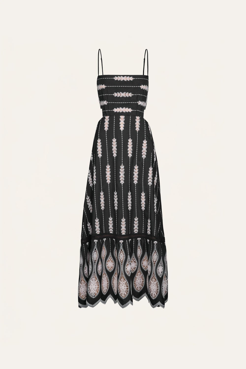 Midi dress in embroidered fabric, featuring a straight neckline, slender straps, and cutouts at the waist. The fitted bodice and softly flared skirt create a structured silhouette.