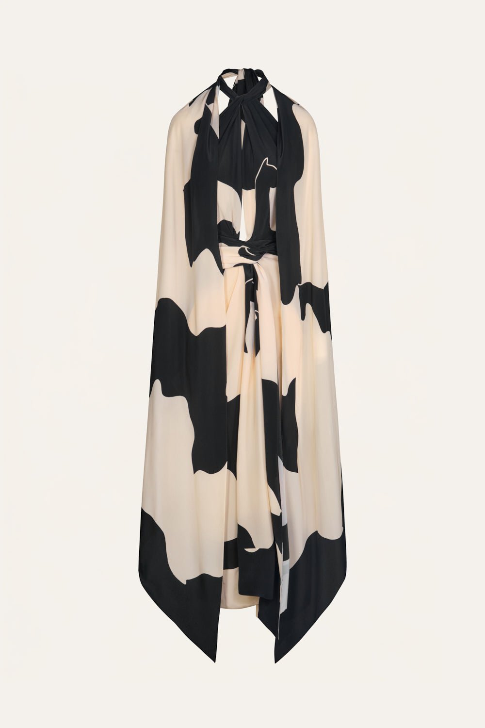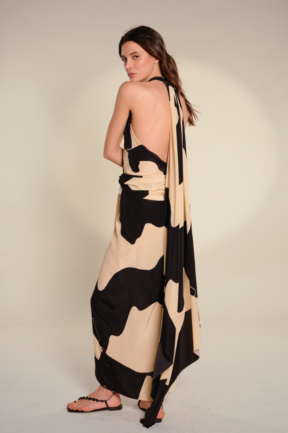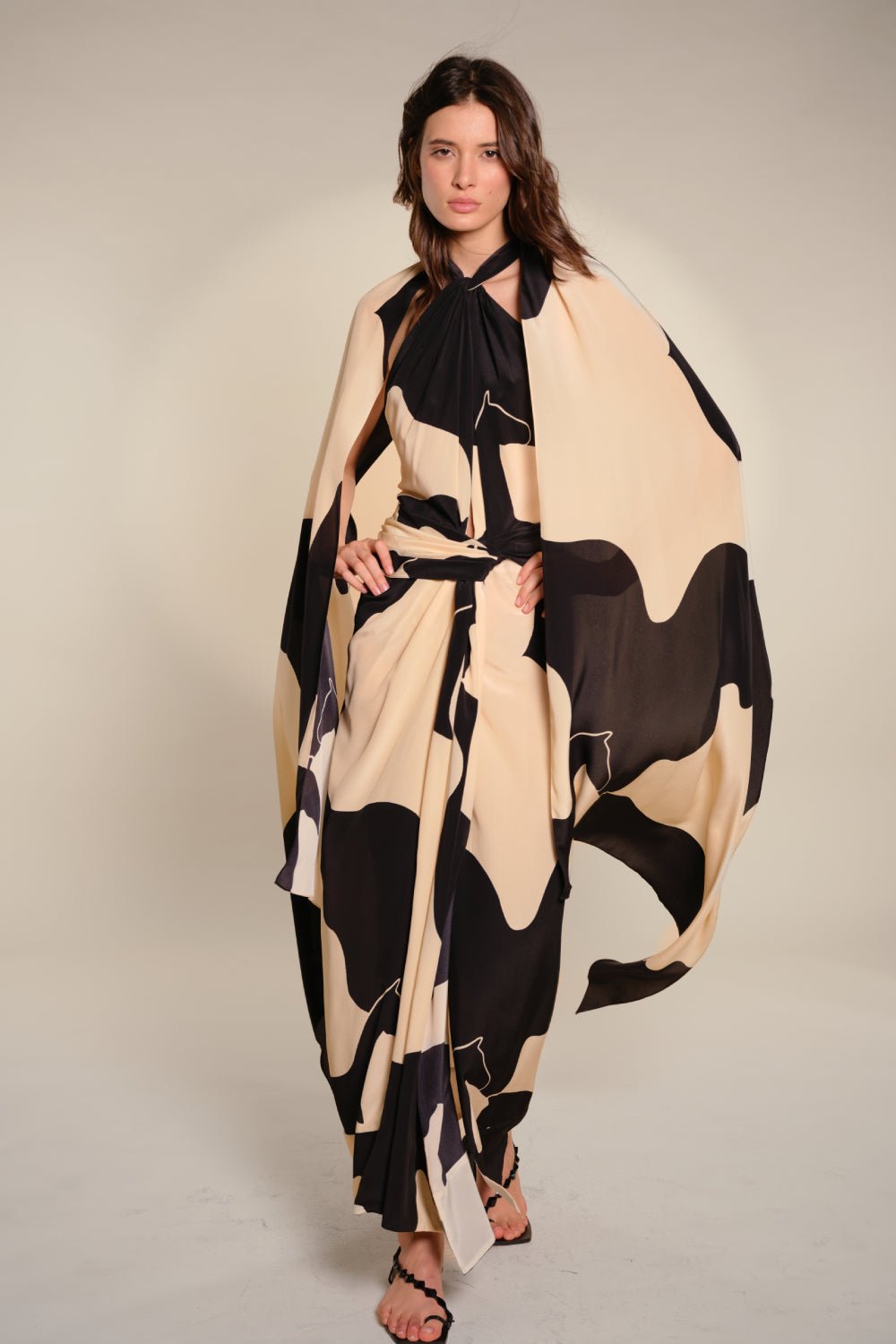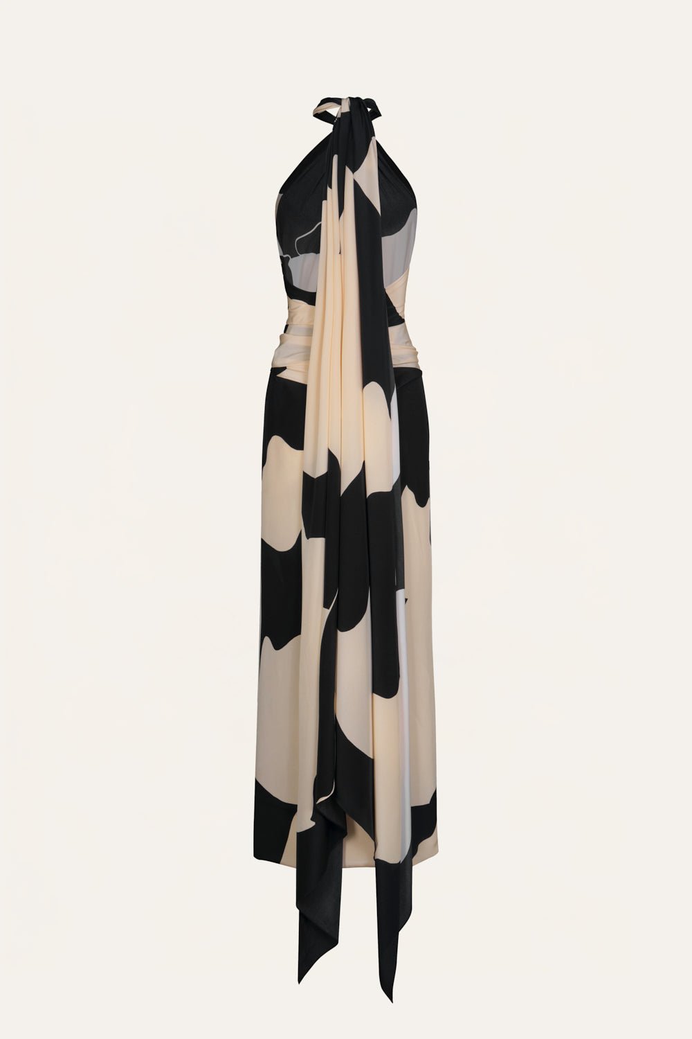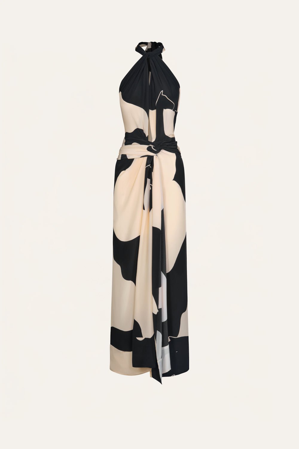 Halter-neck ankle dress cut in flowing silk with an abstract black-and-ivory print. Designed with draped sleeves and a knotted waist detail that adds structure and dimension. A standout silhouette meant to move with ease—ideal for special occasions or elevated everyday moments.
